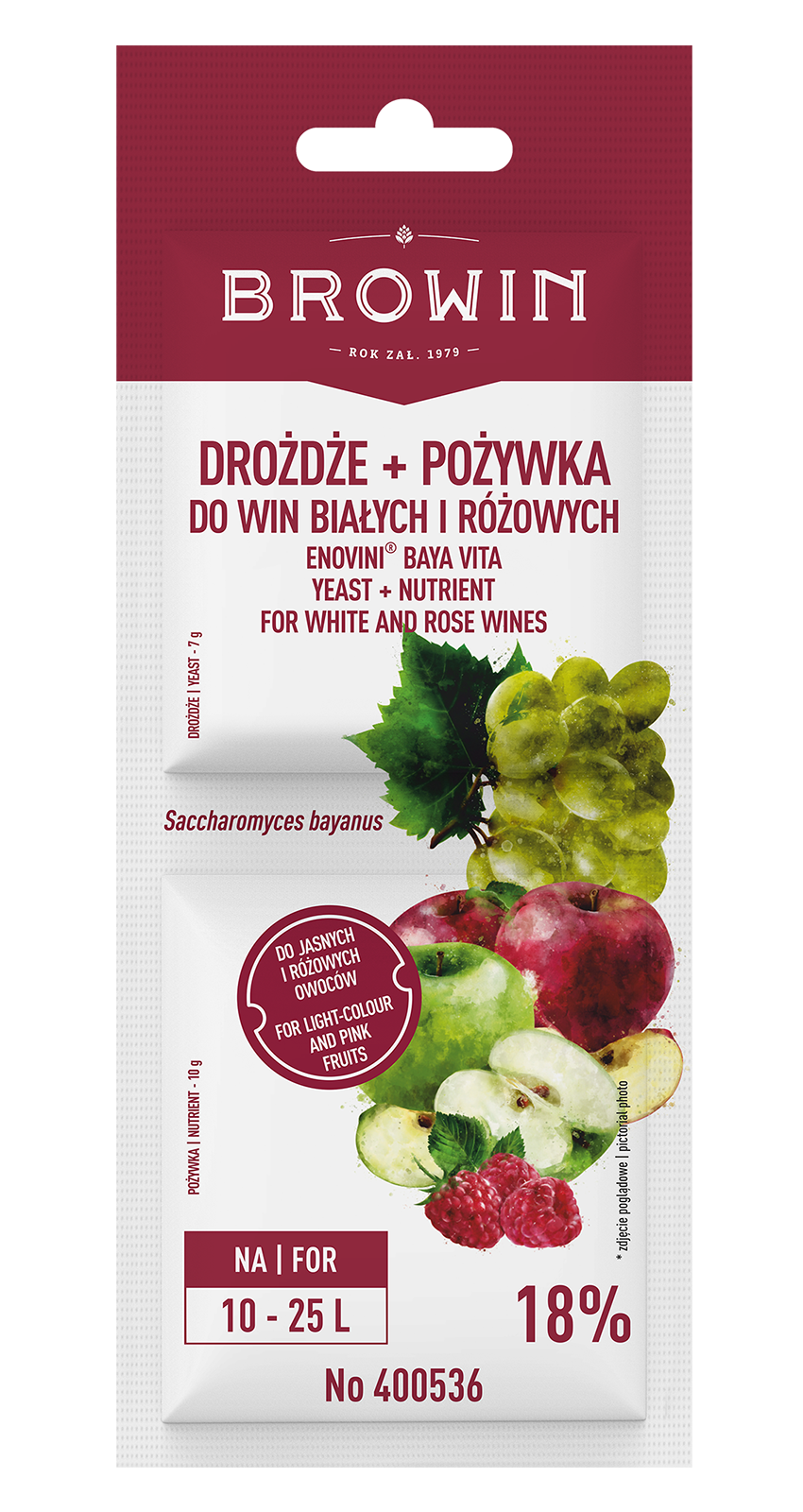 Istruzioni per l'uso: Il lievito non richiede propagazione preventiva. Sciogliere il lievito in 100 ml di acqua bollita, raffreddata a 30 °C, e lasciare riposare per 20 minuti. Quindi versare la soluzione in un recipiente di fermentazione/damigiana contenente la cuvée. Aggiungere la quantità appropriata di sale nutritivo (1 g di sale nutritivo per 1,5-2,5 L di mosto) in tre porzioni uguali: I - prima dell'inoculazione del lievito, II - dopo 2-3 giorni di fermentazione, III - dopo circa 10 giorni, quando la °Blg del mosto scende a 8-12. Sciogliere le porzioni di sale nutritivo in 100 ml di mosto, quindi versare in un recipiente/damigiana e mescolare. Non aggiungere il sale nutritivo direttamente all'inoculazione del lievito!