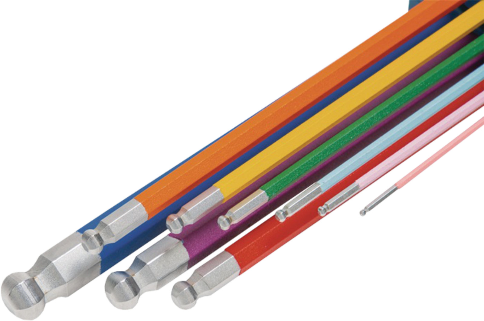 Set di chiavi a brugola con testa sferica · lunghe · con codifica a colori · acciaio S2 · verniciate a polvere · verniciate a polvere · angolate · gamba lunga con testa sferica · consente l'avvitamento fino a un angolo di 25° · gamba corta smussata · Vantaggi speciali del prodotto: · ogni chiave è codificata a colori per una rapida individuazione · Altre caratteristiche tecniche: · Dotazione: SW 1,5 - 10 mm