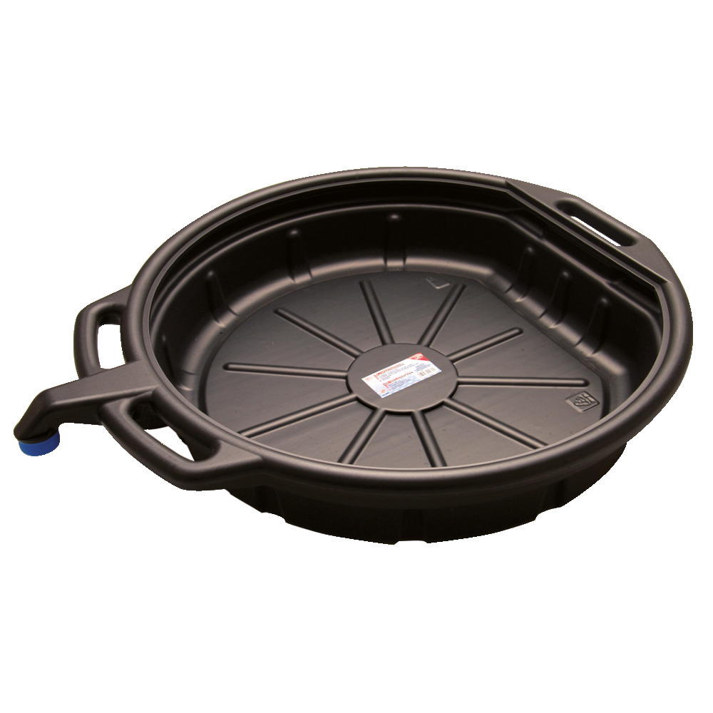 Vaschetta raccogli-olio con capacità di 14 litri e beccuccio. Resistente alla maggior parte dei solventi (fino a 60 °C), acidi, alcali, alcol, olio e benzina. Realizzata in HPDE, resistente agli urti, con diametro di 450 mm, altezza di 150 mm e peso di 1075 g.